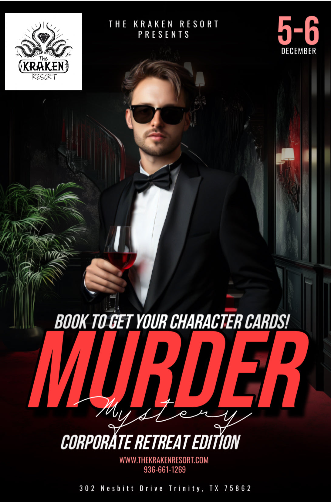 Step into a weekend of secrets, scandals, and shocking twists at The Kraken Resort! Join us December 5–7 for an immersive Murder Mystery experience where every guest becomes a suspect and every clue pulls you deeper into the story. Expect laughs, drama, mystery, and plenty of adult-friendly fun as you work to uncover the killer before they strike again.