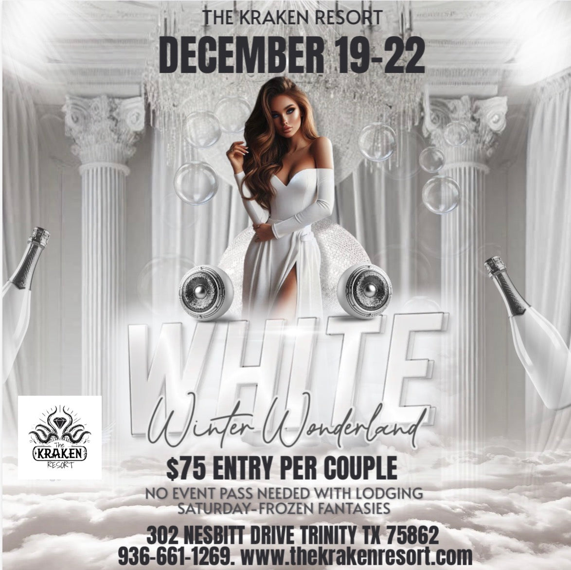 Join us at The Kraken Resort for a breathtaking White Winter Wonderland weekend! Dress in your sexiest white, step into a world of icy elegance, and enjoy a magical adults-only escape filled with shimmer, fantasy, and winter-themed fun.