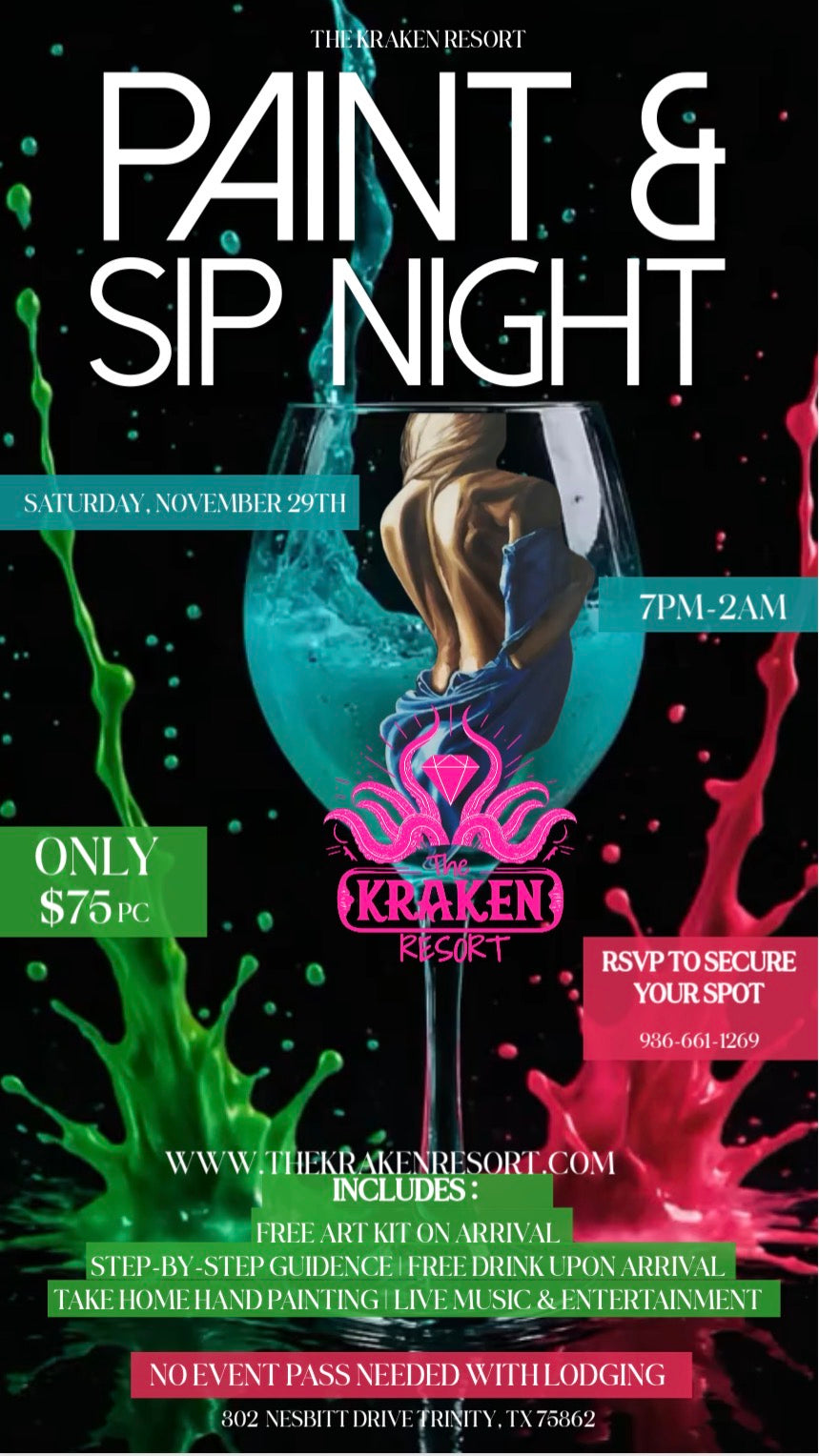 Unleash your inner artist with a splash of sexy fun at The Kraken Resort! Join us for an unforgettable evening of creativity, cocktails, and connection at our Paint & Sip Night. Whether you’re a seasoned painter or a first-time brush holder, our step-by-step guidance and relaxed atmosphere will make your masterpiece shine.